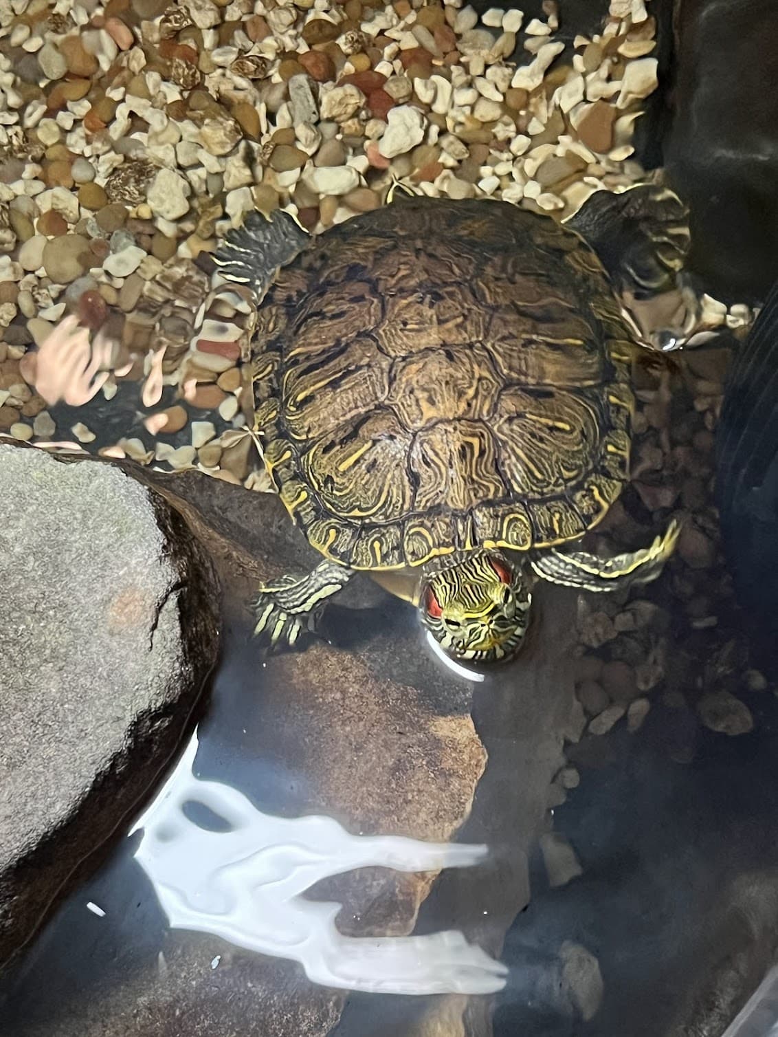 The trio of red-eared were in large individual ‘tanks’ in a northern Virginia DC suburb. All about the same size shells about 6 inches in diameter. Once a day I dropped a few pellets into each tank and put a leaf of romaine lettuce on a rock above water in the tank. 2 or the 3 would come over to the edge of the tanks whenever I came near. The pet parent tells me that they are now in 1 large tank.